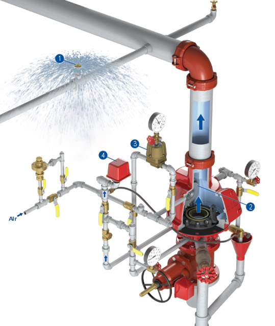 След системите с вода, това е вторият най-често използван тип система. Използва се като алтернатива на системите с вода в места, където съществува риск от замръзване (където температурата на околната среда може да падне под +4°C). За разлика от системите с вода, в тръбите на сухата система има под налягане въздух или азот вместо вода. При активиране на съответното пожарогасително оборудване първо се освобождава въздухът или азотът в тръбите, след което се наблюдава изпускането на водата. Главният контролен клапан, използван в тази система, се нарича суха (dry) алармена клапанна система.